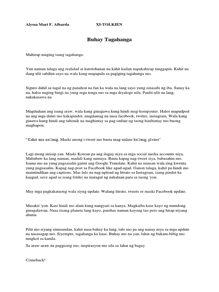 What are you doing now. 1Ang mga ginawa ni Mang Erning sa buong maghapon ay hinatid ang magkapatid na estudiyante at pinalitan ang pundidong ilaw sa kusina at naihati ang kapit bahay na si aling teray patungo sa ospital. Pumiyok ang aming guro habang gumagawa ng lesson niya kaya napatawa ang buong klase.