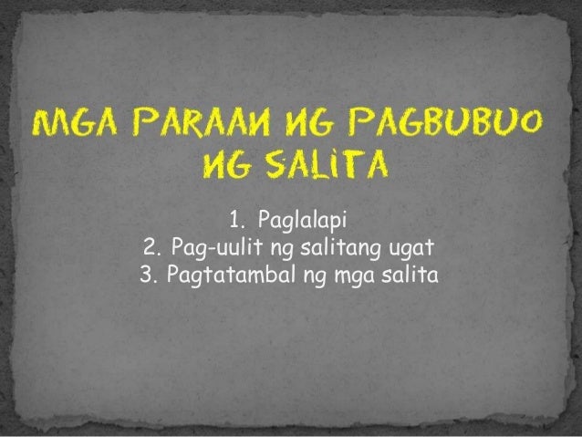 Pagtatambal pinagsasama sa isang pahayag ang dalawang salitang pinagtambal para makabuo ng isang salita. Halos hindi ko maintindihan si Marites dahil napakabilis niyang magsalita7. Takbo tatakbo Kung dalawang titik ang unang pantig inuulit ang dalawang ti tik.