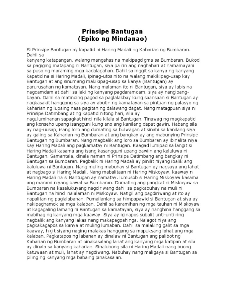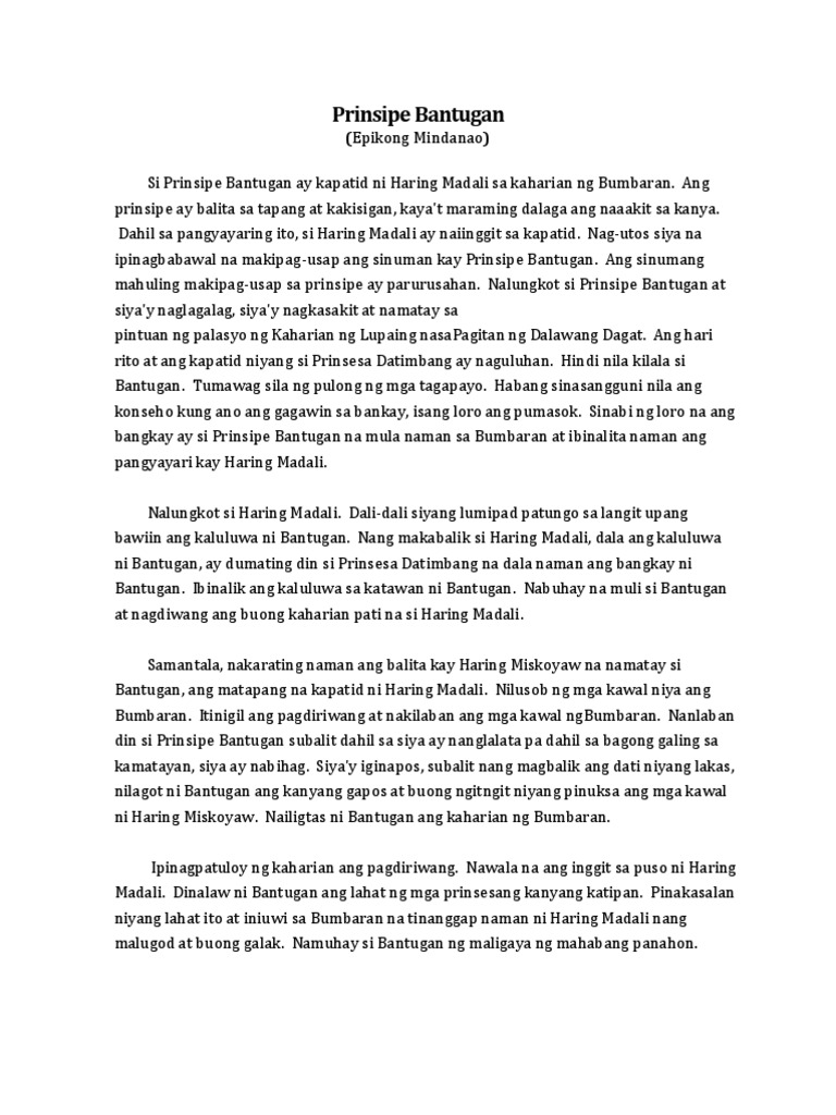 Dahil sa kanyang katapangan walang mangahas na makipagdigma sa Bumbaran. Prinsipe Bantugan Epiko ng Mindanao Si Prinsipe Bantugan ay kapatid ni Haring Madali ng Kaharian ng Bumbaran. Maikling kuwento na may tanong at.