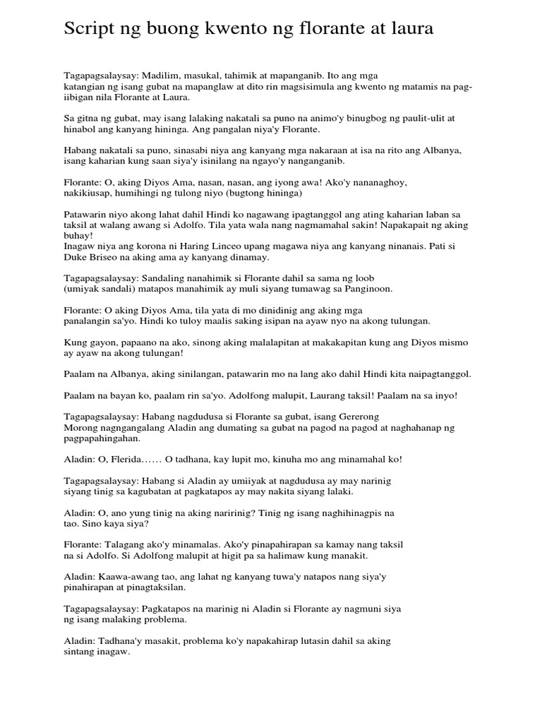 24-12-2017 Tinapos niya ang pagsasalaysay sa pagkuha ni Adolfo sa trono ng Albanya at ang pag-agaw sa kanyang minamahal na si Laura hanggang sapitin niya ang masamang kalagayan sa gubat. 22-01-2020 Hindi rin Florante at Laura ang tunay na pamagat ng akdang ito Balagtas. Ang buong kwento ng florante at laura tagalog - 2647752 1.