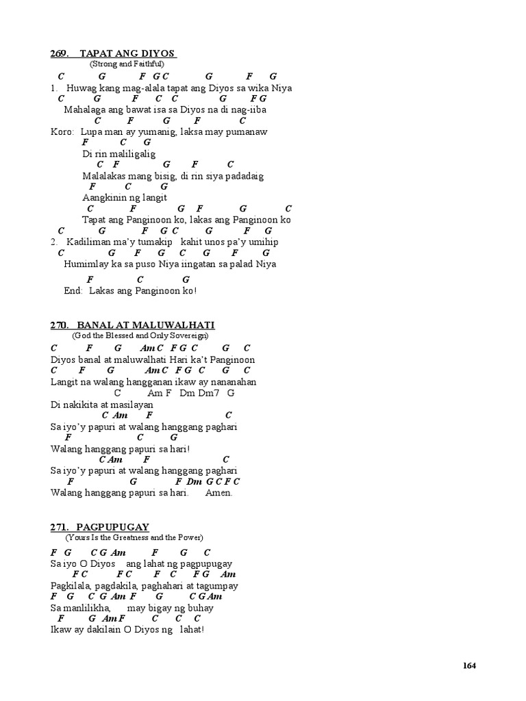 06-03-2017 Intro G-A7-D-Bm-Em-A7-F7-B7-Em-A7-D Refrain D A7 Bm-D7 G B7 Em Purihin ang Panginoon Umawit ng kagalakan G A7 D Bm Em A7 F7-B7 At tugtugin ang gitara At ang kaaya-ayang lira Em A7 D Hipan ninyo ang trumpeta Verse 1 Am7 D7 G Em Am7 D7 G Sa ating pagkabagabag Sa Diyos tayoy tumawag Bb C7 F Dm Gm A4-A-A9-A7 Sa ating mga kaaway. 42245 views added to favorites 310 times. This site provides liturgical songs praise worship Marian and other religious songs complete with lyrics and chords.