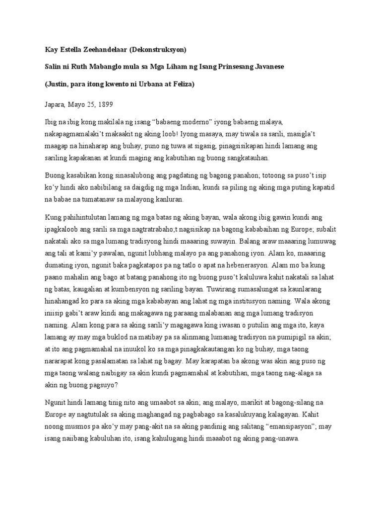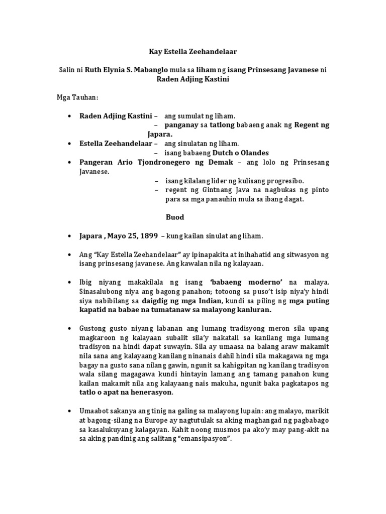 Mendoza Rose Anne R. Aralin I KAY ESTELLA ZEEHANDELAAR Anu-ano ang mga tiyak na matututunan mo. Mabanglo mula sa mga liham ng isang prinsesang javanese japara mayo 25 1899 ibig na ibig kong makilala ng isang babaeng moderno iyong babaeng malaya nakapagmamalakit makaakit ng aking loob.