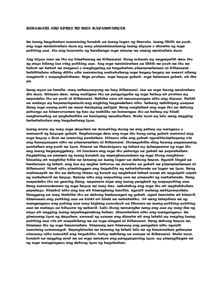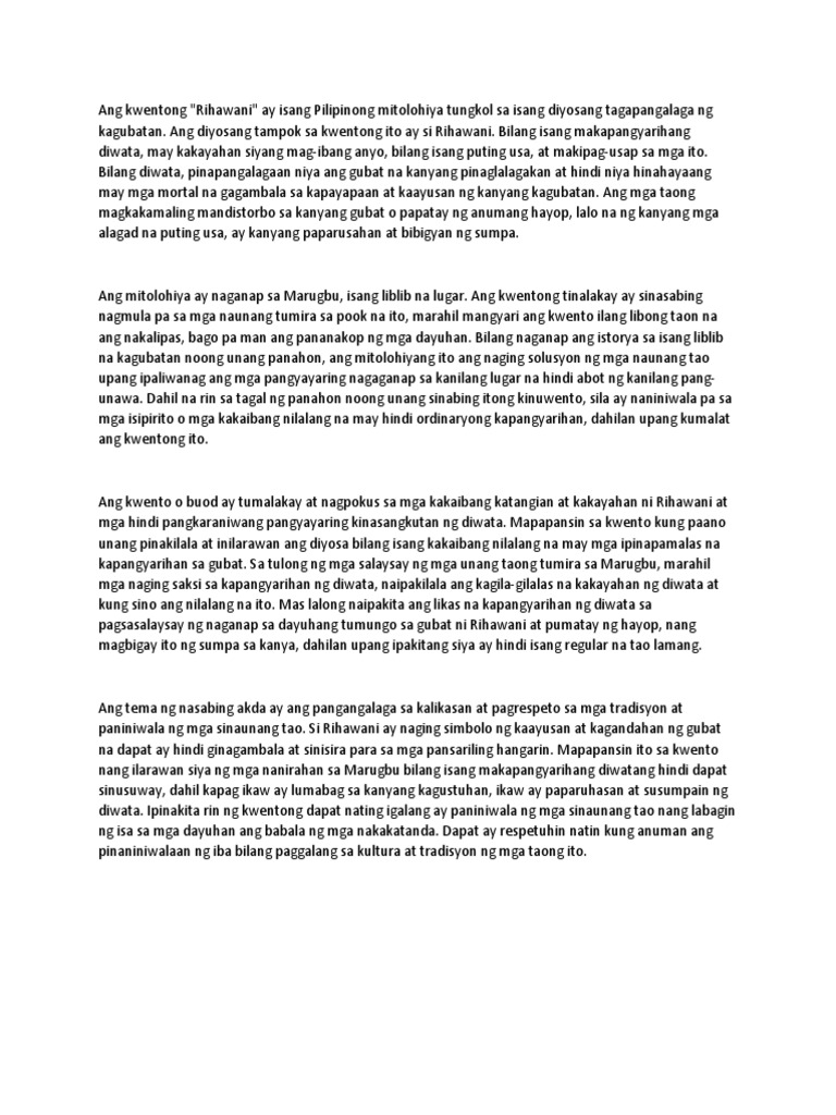 Tulad ng nangyari sa kwento kung saan sinuway ng mangangaso ang. Ang kwentong Rihawani ay isang epiko ng Kapampangan Ito ay kwento ng isang kilalang Diyosa na namamalagi sa kabundukan. 19-07-2019 Ito ay anyo ng panitikan na nagsasaad ng isang buong kwento na kayang tapusing basahin sa isang upuan lamang.